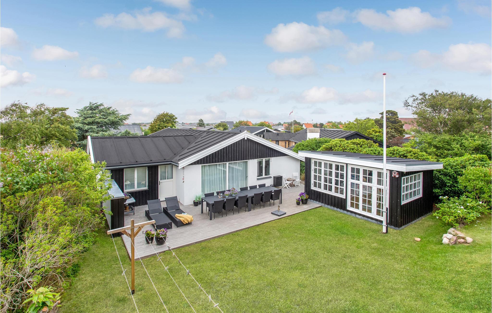 5,0Moderne sommerhus nær stranden. Dette smukke træhus ligger kun ca. 500 m fra sandstranden og er ideelt til en fantastisk ferie med familie eller venner. Husets hjerte er den åbne stue med spiseplads og åbent køkken. På kølige dage giver brændeovnen behagelig