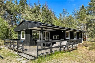 3,0Velbeliggende og godt indrettet feriehus med brændeovn og farve-tv. Huset har en dejlig sydvendt terrasse med havemøbler og grill. Det er indrettet med en stor stue med en pæn køkkenafdeling. På badeværelset er der gulvvarme. Huset ligger på en stor