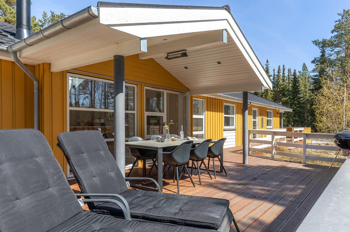 5,0Omgivet af fyrretræsbevoksede småbakker ligger dette flotte feriehus midt i den fredfyldte og dejlige natur. Huset er omgivet af afskærmede terrasser, hvor I dagen lang kan nyde solen og de skønne omgivelser. I kan naturligvis også vælge Dueoddestrandens
