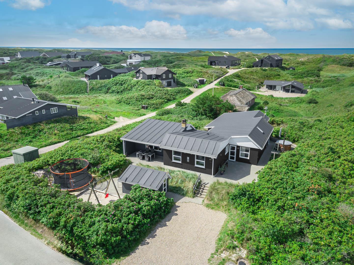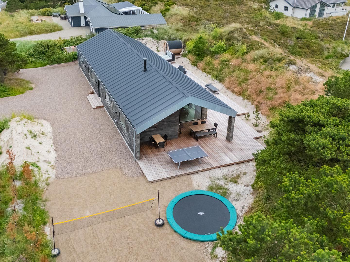 På en stor kuperet klitgrund med panoramaudsigt over områdets klitter samt sommerhusområde, ligger dette meget velholdte og yderst praktisk indrettede sommerhus med større aktivitetsrum samt vildmarksbad. Huset har i alt to komplette badeværelser - det ene