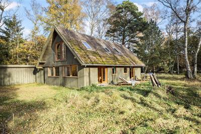4,3Afskærmet af store træer ligger dette sommerhus ved Tisvildeleje opført i træ og med græs på taget. Hele sommerhuset er opført i lyse træmaterialer med frilagte bjælker og loft til kip. Her er tre soveværelser, bryggers med vaskefaciliteter, to badeværelser