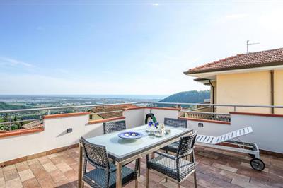 Ca. 500 m fra Pedona venter denne del af et hus på en skøn ca. 8 ha stor privat grund på toppen af en bakke i Versilia med udsigt over en bred kyststrækning ved Viareggio, Lido de Camaiore, Forte dei Marmi og øen Capraia i det fjerne. Stort fælles grønt