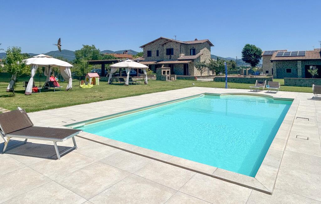 Stuehus med privat pool og panoramaudsigt. Dette hus har en smuk panoramaudsigt 700 m over havets overflade og fordeler sig over tre etager. Feriehuset har med fire soveværelser og fem badeværelser plads nok til 16 personer. To kæledyr er også velkomne.