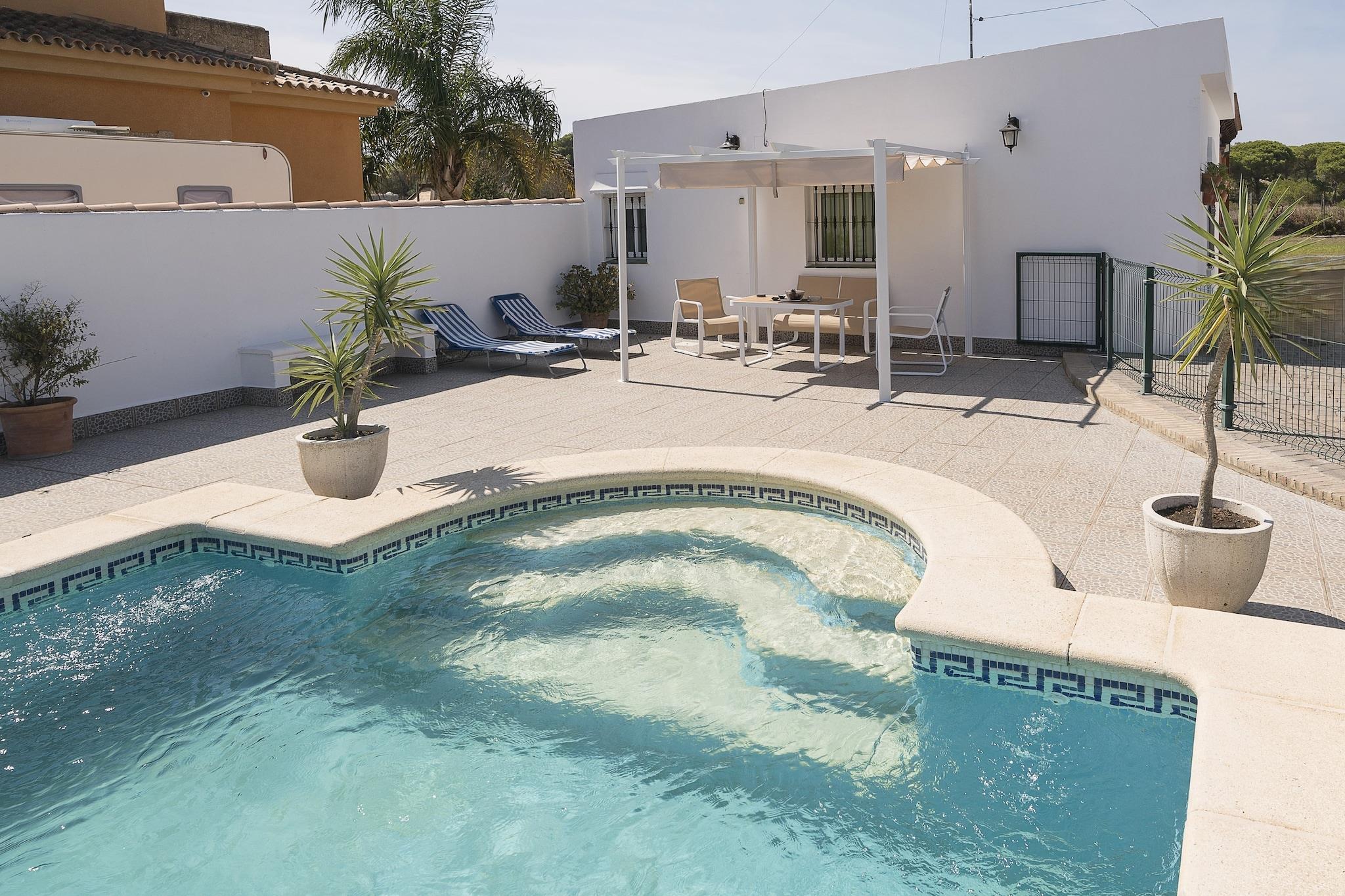 Familievenligt feriehus med pool nær naturparken Bahia de Cadiz. Der er lagt op til en ferie med selvforkælelse for hele familien under den sydspanske sol. Basen for jeres siesta fra hverdagen bliver dette rummelige hus, der er kendetegnet ved et rar og