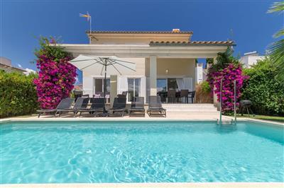 4,4Marissa II Home nær stranden Bolig: Dette stilfulde og moderne familiehus Bella Mar II i det fredelige Barcares-område nær Alcudia er et ideelt tilflugtssted for op til 8 gæster. Huset har 4 komfortable soveværelser med dobbeltsenge og 3 badeværelser samt