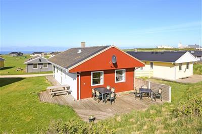 4,5Sommerhus i 1. række med panoramaudsigt over det brusende Vesterhavet såvel ude som inde. Huset fremstår lyst og er praktisk indrettet med kombineret stue/køkken. Stuen har panoramaudsigt over Vesterhavet samt er udstyret med bl.a. fladskærms-tv,