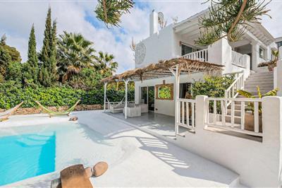 Beliggende på en 1.000m2 åben grund, er denne fantastiske 250m2 Ibiza villa et oase af afslapning og stil, perfekt til en uforglemmelig ferie. Fra første øjeblik sætter den indbydende overdækkede terrasse med plyssofaer tonen til komfort. Dette er et