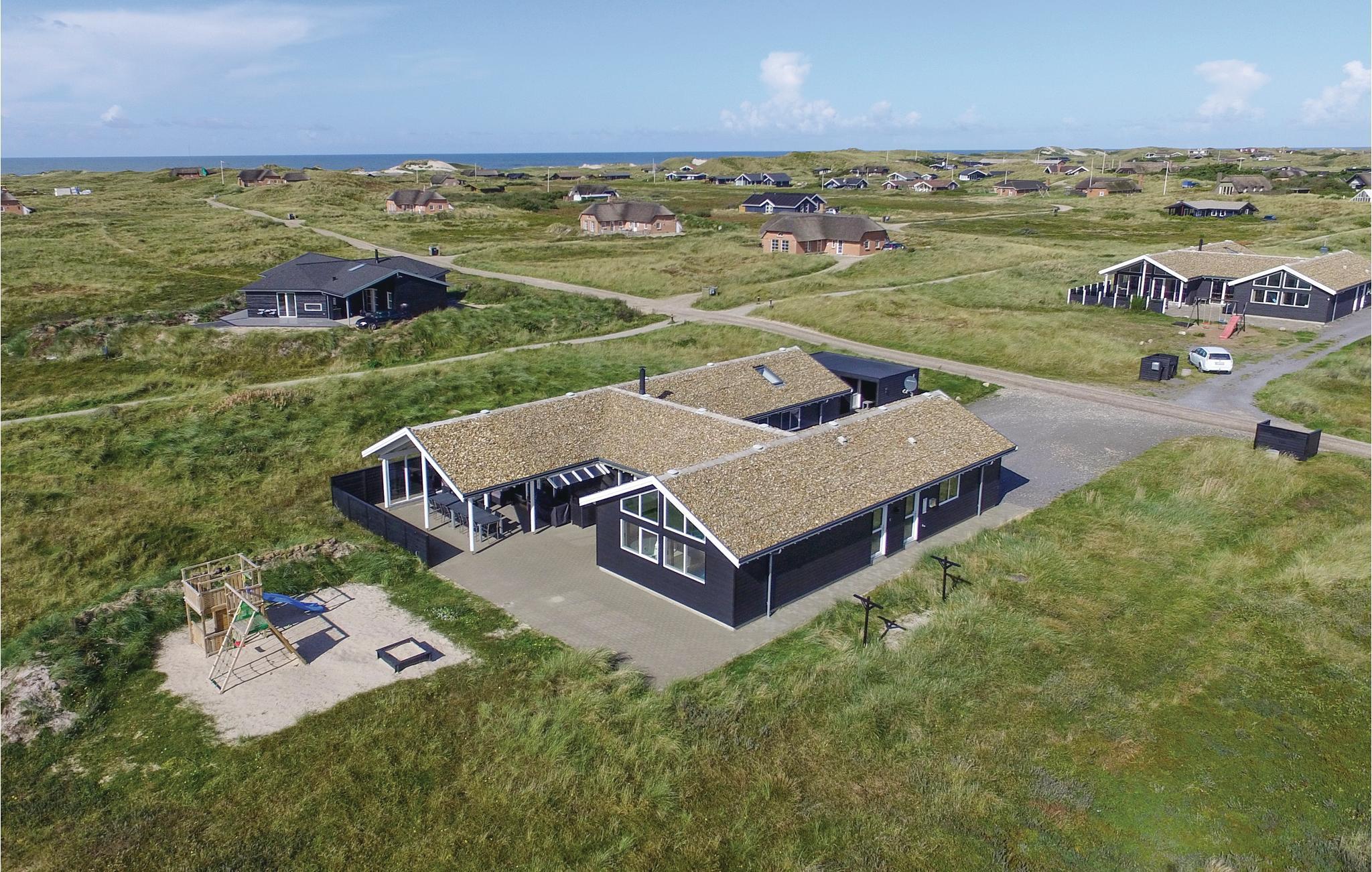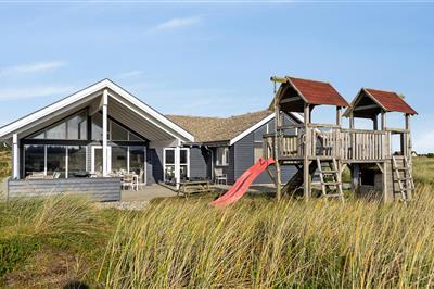 4,5På en delvist lukket klitgrund tæt ved Vesterhavet og Ringkøbing Fjord ligger dette skønne sommerhus med plads og faciliteter til 14 personer. Husets centrale rum er den store spise- og opholdsstue, som er elegant indrettet med et stort og flot langbord til