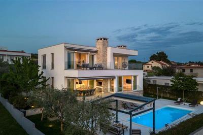 4,4Villa i Kozino ved Adriaterhavet Bolig: En moderne, rummelig luksus tre niveau villa beliggende ved vandkanten med uhindret udsigt over Adriaterhavet. Gulv til loft vinduer oversvømmer villaen med naturligt lys og giver en fantastisk udsigt over havet og