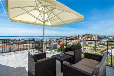 5,0Fantastisk villa med udsigt over havet og Split. Hvis I går med drømme om en uforglemmelig ferie, så lad dem opfylde i dette komfortable og moderne hus i Podstrana. På hustes tre etager kan I nyde boligens luksus og højkvalitetsmøbler og udnytte den store
