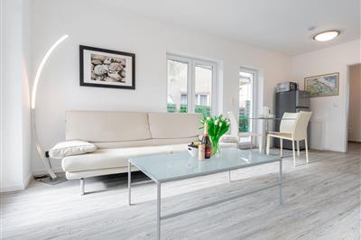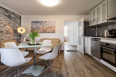 Ferielejligheden, der blev moderniseret i 2015, ligger i stueetagen af en ferievilla i lokal beliggenhed, ca 700 m fra Østersøstranden.Den er udstyret med stue (dobbelt sovesofa, polstrede møbler, spiseplads, fladskærms-tv, radio/CD, DVD), soveværelse