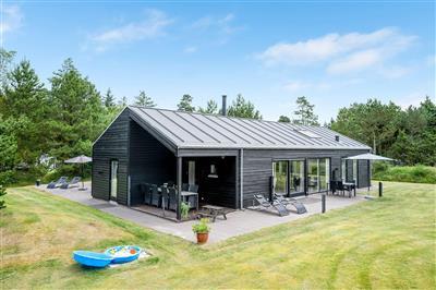 5,0Sommerhuset er smagfuldt indrettet i moderne design. Beliggende på en stor naturgrund i et roligt og populært ferieområde, en frisk gåtur fra nok Danmarks bedste badestrand og det aktive butiksmiljø. Til huset hører dejlige terrasser, hvoraf en er overdækket,