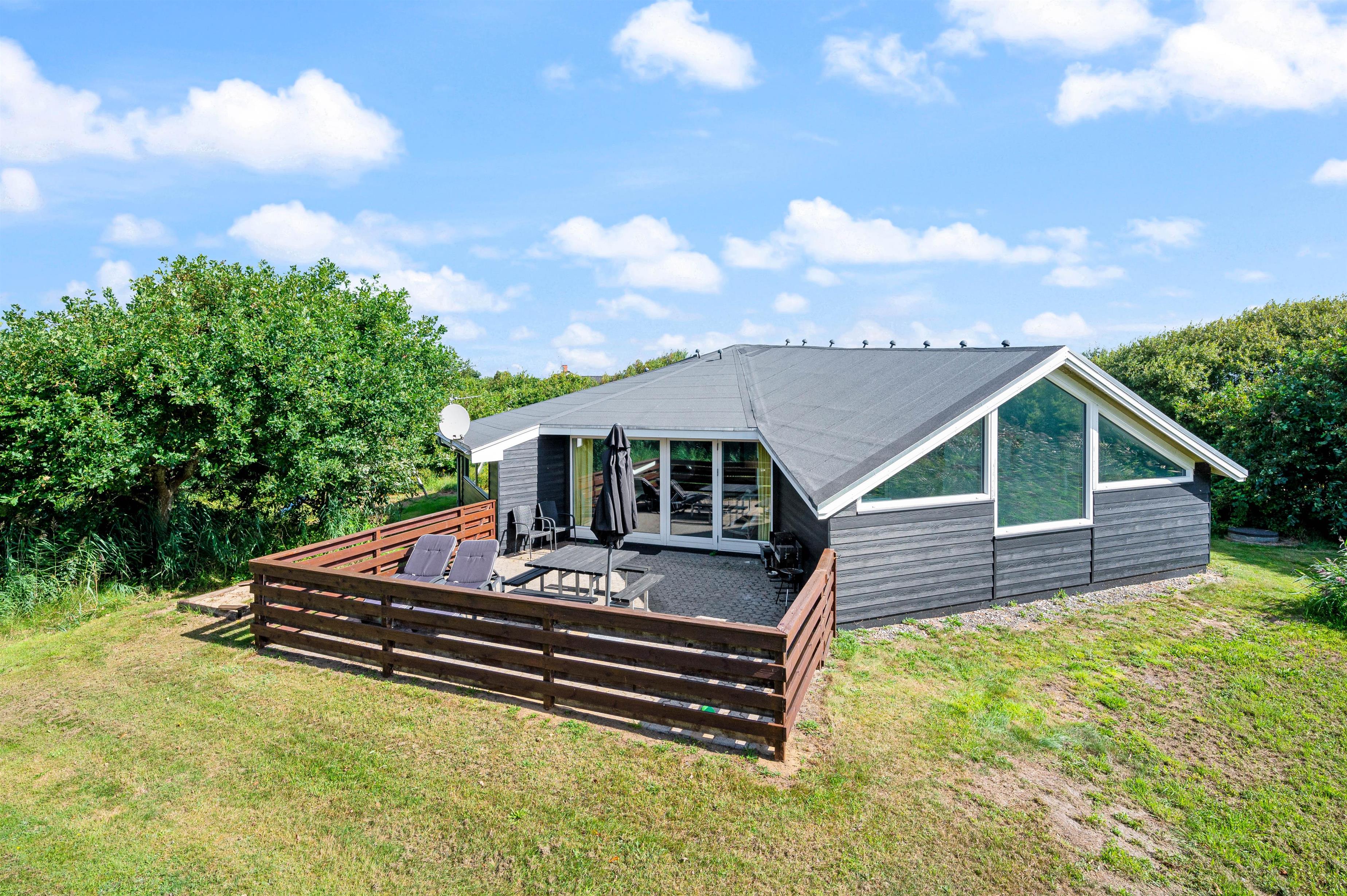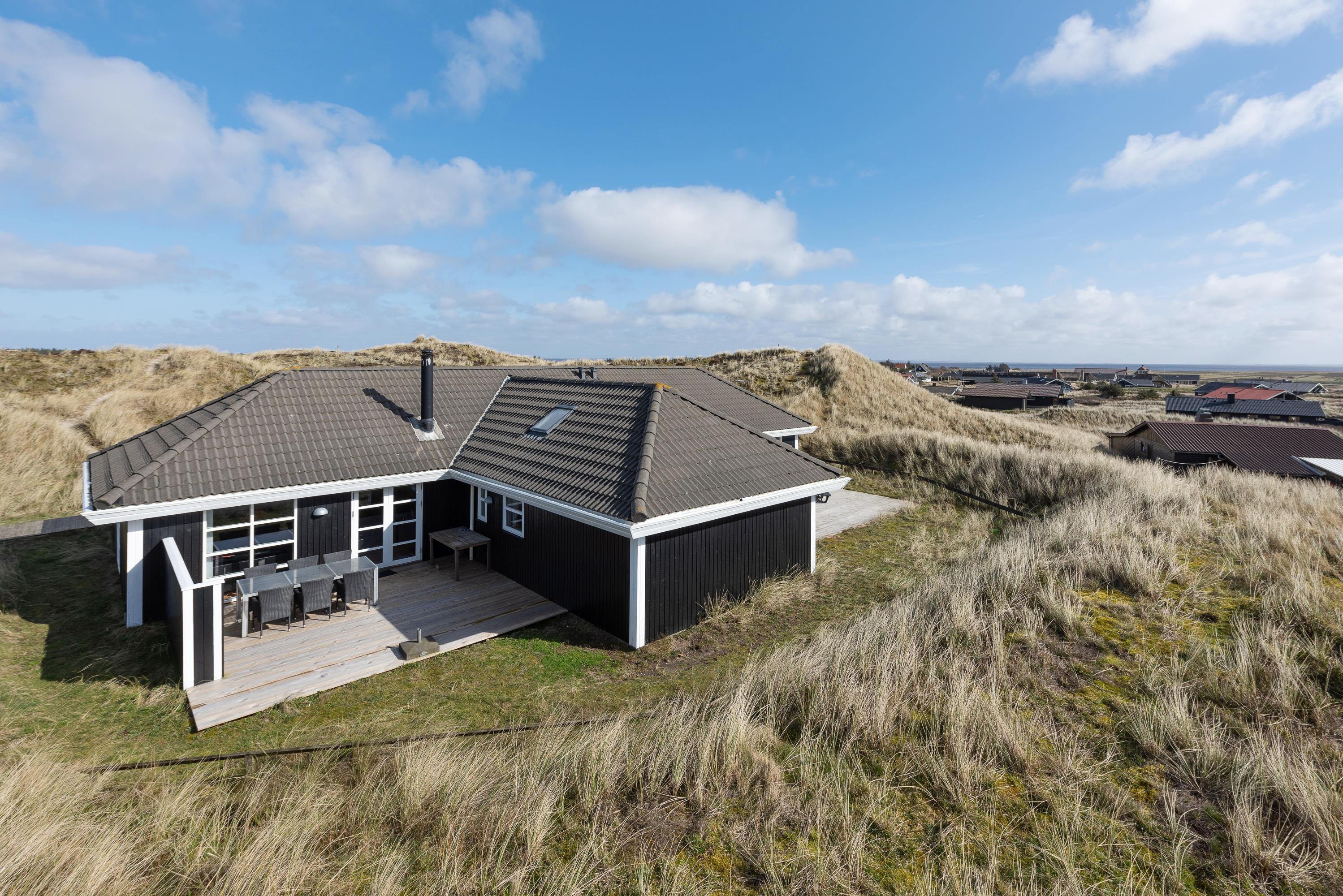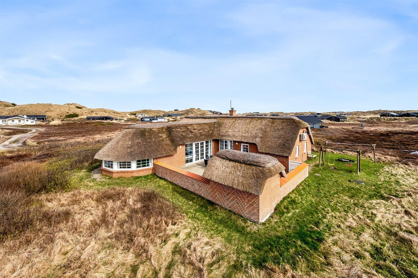 3,3Dette spændende feriehus med swimmingpool ligger på en let kuperet klitgrund, tæt på sidste klitrække ud mod Vesterhavet. Huset er ideelt til to familier, idet soveafsnittet er opdelt i to afdelinger med hver sit badeværelse. Køkken/opholdsrummet er rummeligt