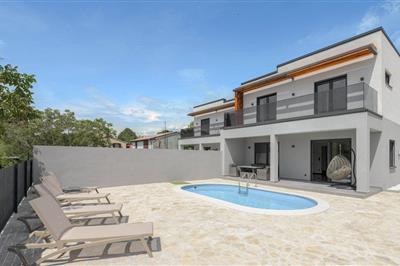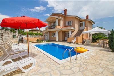 Denne skønne halvdel af et dobbelthus med tilhørende swimmingpool ligger blot 10 minutter i bil fra feriebyen Rabac, den by der kan prale af de skønneste strande i Istrien. Det er komfortabelt og godt indrettet. I stueplan ligger det rummelige køkken med