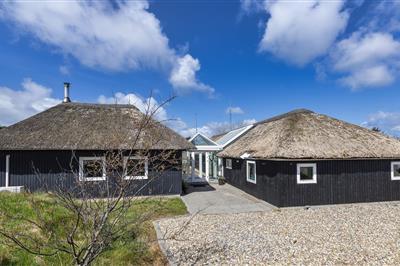 3,7Stråtækt idyllisk sommerhus med pool der består af to smukke, sortmalede træhuse, som forbindes af et glasparti. Huset indbyder både til den kræsne familie som til storfamilien, venner der ønsker at holder ferie sammen med mulighed for at trække sig tilbage.