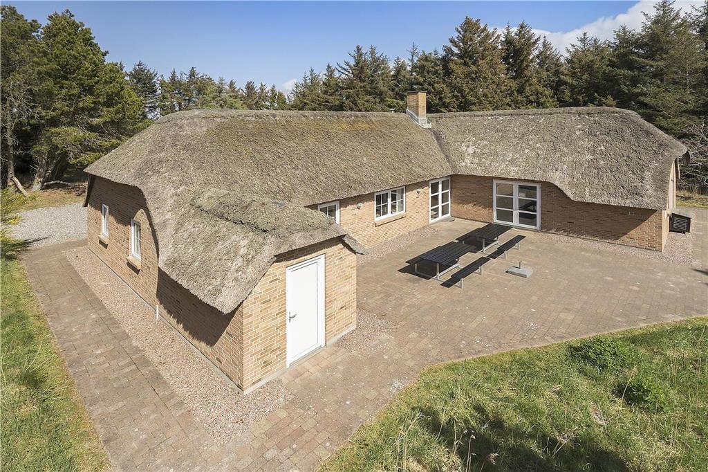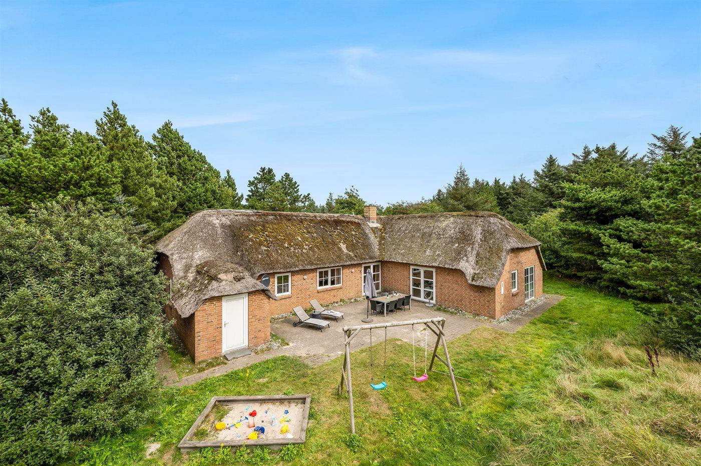 3,0Dette velholdte sommerhus i sten med stråtag, bygget i 1993, ligger på en meget stor og ugenert naturgrund, omgivet af træer og buske. Til huset hører en stor terrasse med havemøbler. Huset ligger i et af de skønne sommerhusområder langs den jyske Vestkyst.