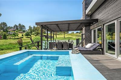 3,5Dette fantastiske feriehus er yderst velindrettet og holdt i en lys og moderne stil. Det skønne køkken-/stueareal har loft til kip, komfortable møbler og er dejligt at opholde sig i. Til de vandglade er der en dejlig poolafdeling med swimmingpool,