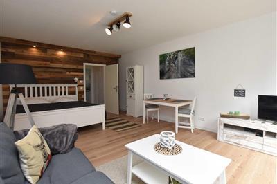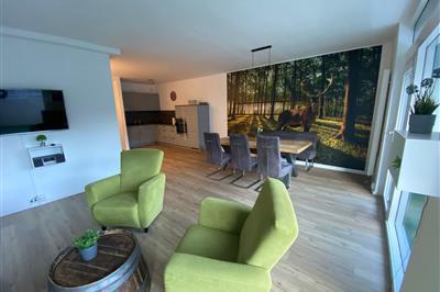 Lejlighed med et soveværelse Bolig: Ferielejligheden Am Wäldchen er smagfuldt og moderne indrettet. Den ligger på første sal og har separat indgang og direkte adgang til haven, som også har en privat terrasse til solbadning og grill. Opholdsstuen har en