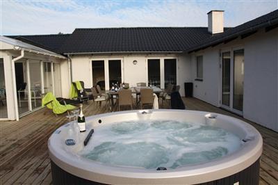 5,0Rigtigt lækkert hus med mange fine detaljer. Wellnesbadeværelse med infarød sauna (2 personer) og stort badekar hvor man rigtig kan slappe af. På den 80 m2 træterrasse finder I loungemøbler, liggestole og udendørs spa til 8 personer. Der er desuden et