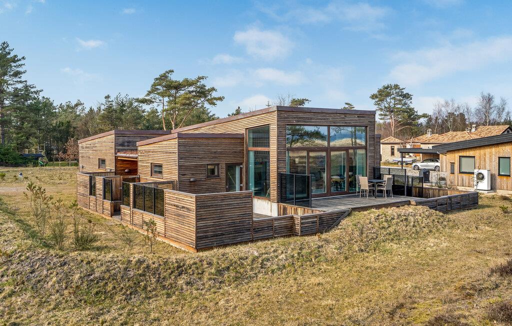 4,5Flot og lækkert sommerhus med smart arkitektur og panoramaudsigt til havet. Træd ind i dette helt særlige sommerhus, som er rummeligt og behageligt, mens der samtidig viser sig flotte arkitektløsninger overalt. Her bliver boligen en ekstra del af oplevelsen