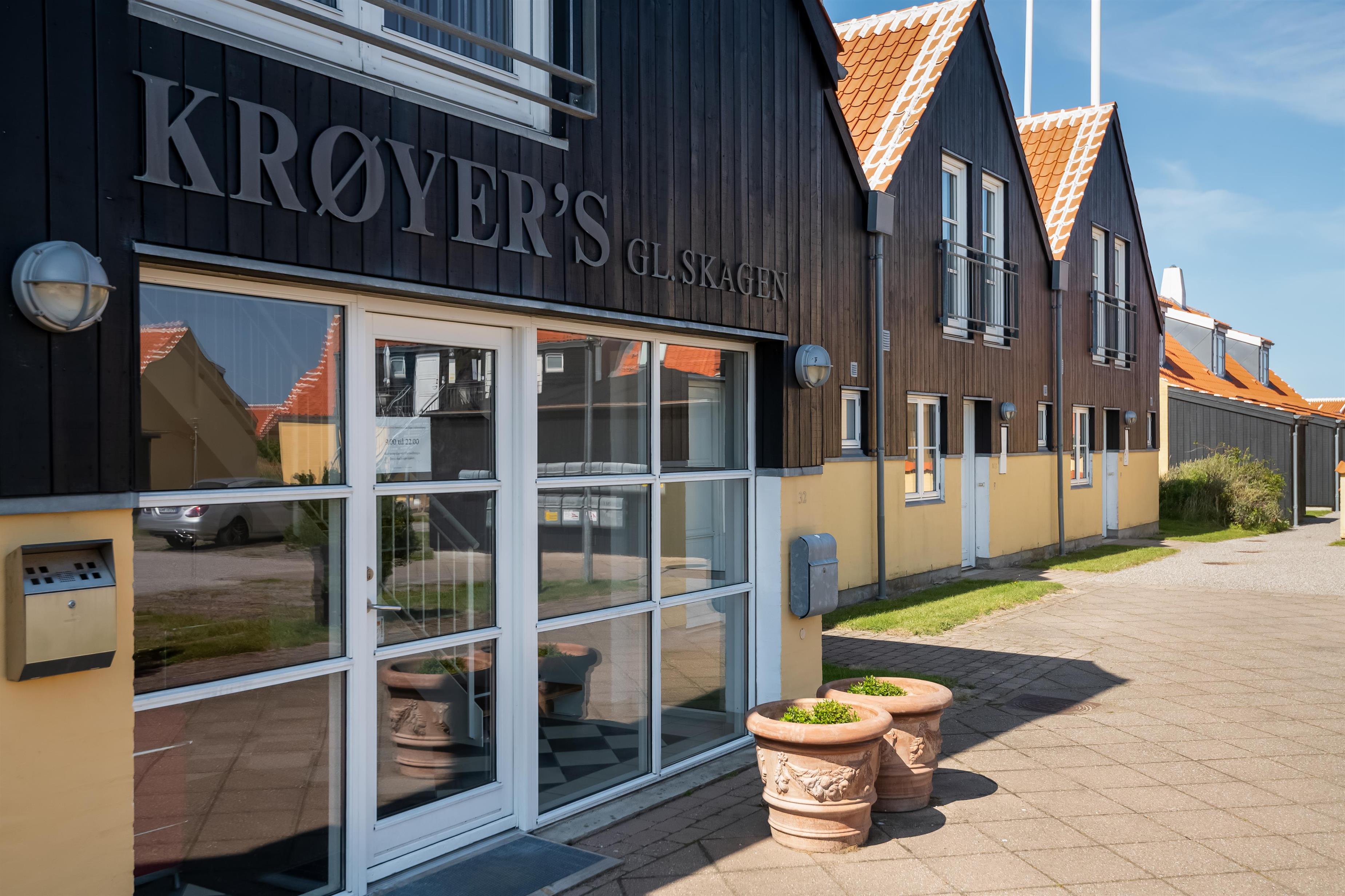 4,4Super smart og hyggelig ferielejlighed på 1. sal i det populære Krøyer’s i Gl. Skagen. Via en bred metaltrappe fra parkeringspladsen nås reposen og lejlighedens indgang. Udenfor døren står et lille cafébord med to stole – perfekt til morgenkaffe eller en