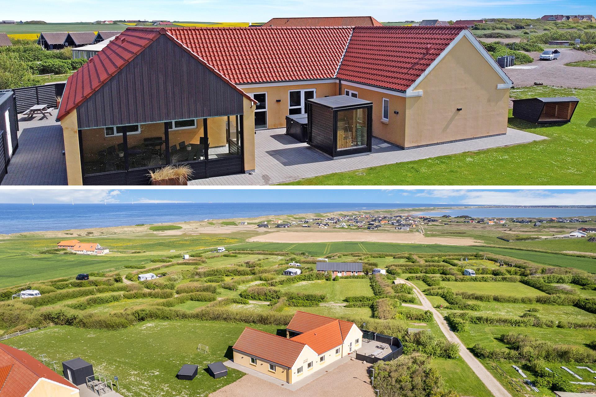 4,8Højt, fantastisk beliggende, nybygget luksushus. Huset er bygget ved Bovbjerg Klint og har havkig til Vesterhavet. Der er bl.a. udendørs spabad og en udendørs sauna, gratis WLAN og aktivitetsrum med bordfodbold, bob og dart samt TV. Et hus med plads til max