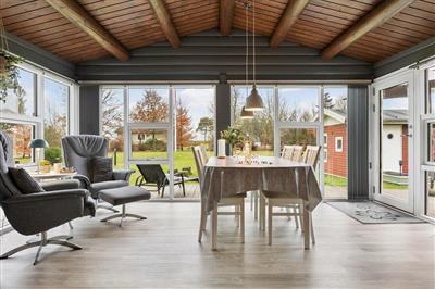 4,0Arkitekttegnet sommerhus beliggende kun ca. 900 meter fra fjorden med børnevenlig strand. Sommerhuset er luksuriøst, lyst og praktisk indrettet med køkken-alrum i åben forbindelse med stuen. Herfra er der direkte udgang til den store træterrasse. I
