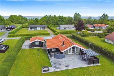 5,0Pænt og velholdt sommerhus beliggende nær vandet og god badestrand på en dejlig grund med en stor græsplæne i et dejligt ferieområde. Til huset hører et delvist overdækket og afskærmet terrasseareal samt flere små åbne terrassekroge omkring huset. Indvendigt