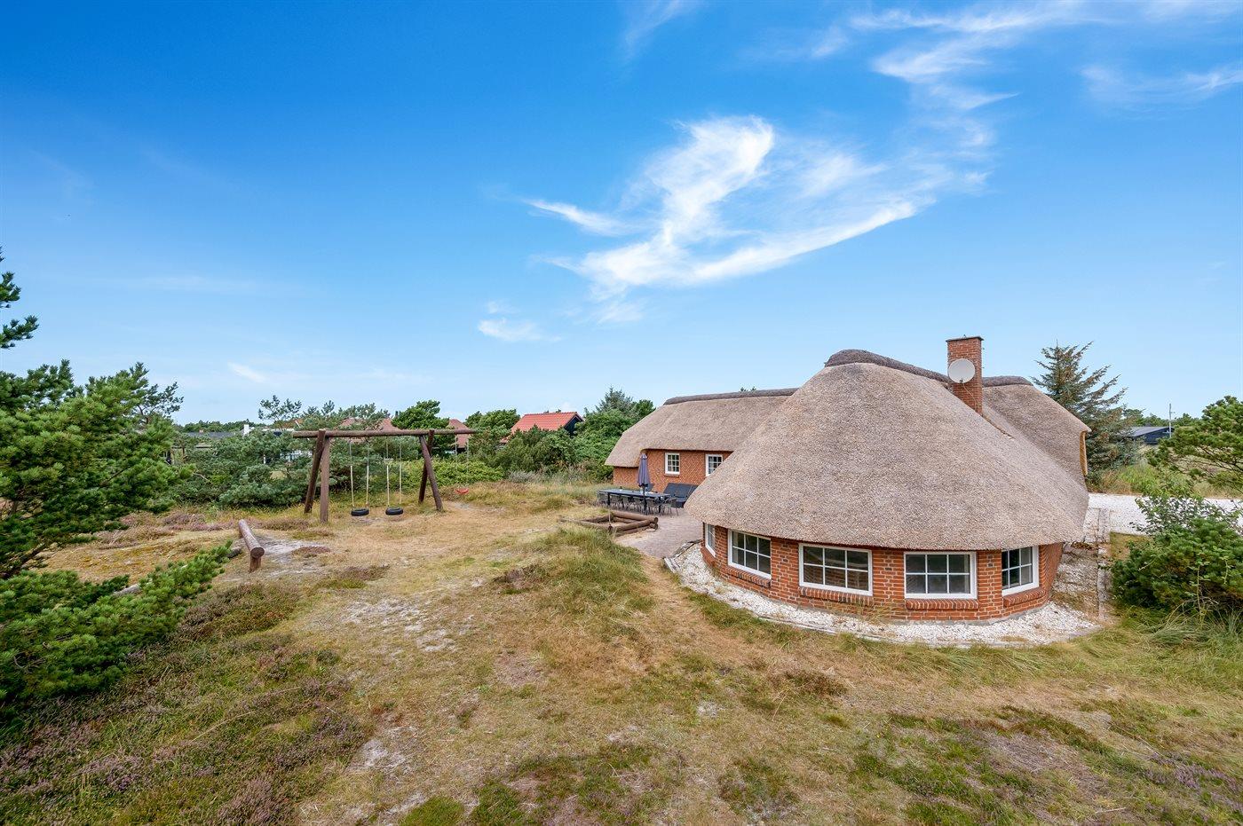 4,5I et naturskønt område på Holmsland Klit, kun 900 m fra Vesterhavet, og få min. kørsel fra badebyen Søndervig, ligger dette dejlige og rummelige sommerhus. Huset er bygget i sten med stråtag i 1994 og ligger på en skøn natur-/klitgrund. Åbent terrasseareal