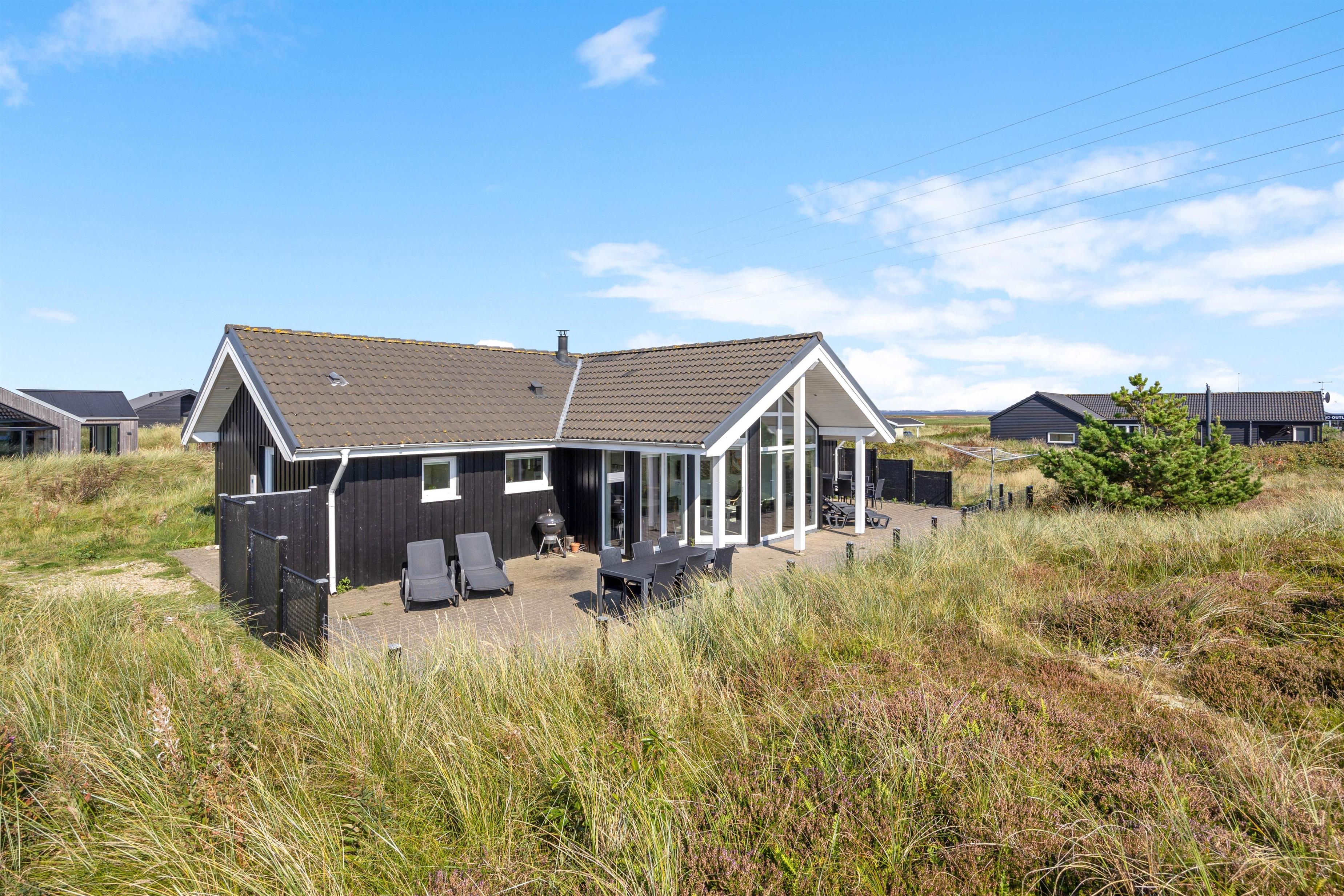4,6På en delvist lukket klitgrund tæt ved Vesterhavet og Ringkøbing Fjord ligger dette skønne sommerhus med plads og faciliteter til 14 personer. Husets centrale rum er den store spise- og opholdsstue, som er elegant indrettet med et stort og flot langbord til