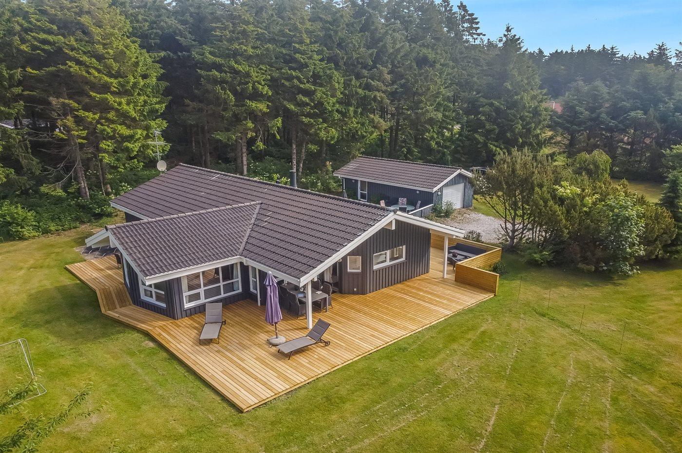 5,0Dette dejlige feriehus, der er bygget i stilen med rå tømmer, der går igen i hele huset, giver hyggelig stemning herude midt i skove. Indenfor byder huset velkommen i et pragtfuldt, stort køkken/alrum med et langbord, hvor alle kan sidde og spise sammen, samt
