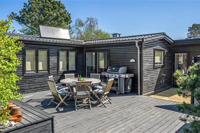 4,3Lille sommerhus ca. 200 m fra vandet. Huset er højt beliggende på skrånende grund med anlagt have. Annekset er beliggende i bunden af haven, hvor der er gynge og sandkasse. På den overdækkede terrasse kan de lange sommeraftener tilbringes og aftensmaden