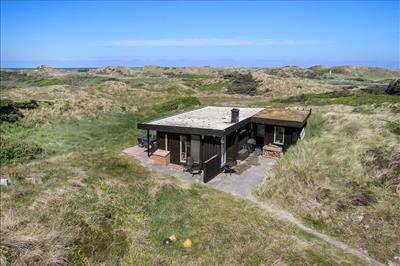 3,8Arkitekttegnet sommerhus med spabad både ude og inde og et aktivitetsrum. Huset er lidt højt beliggende på en stor klitgrund ca. 100 m fra hav og strand og med en enestående udsigt over klitområdet ved Tranum Strand. Huset er i to plan og indeholder