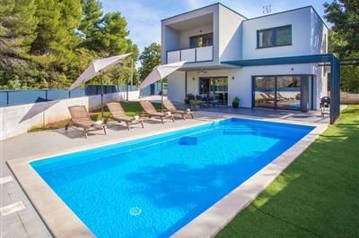 5,0Den smukke Villa Nebra i Istrien beliggende kun 2 km fra kysten er det perfekte valg til en fredelig familieferie. Foran denne smukt moderne møblerede villa er der en terrasse med privat pool samt en overdækket terrasse med spisebord og grill, hvor du kan