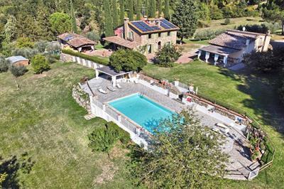 4,0Feriehus med pool, fitnesscenter og stor have i nærheden af Montaione i en panoramisk position. Ejendommen er helt indhegnet og dækker ca. 1000 m², dels med græsplæne og dels med skov. Der er et hovedhus, et udhus med udstyret gymnastiksal, en swimmingpool,