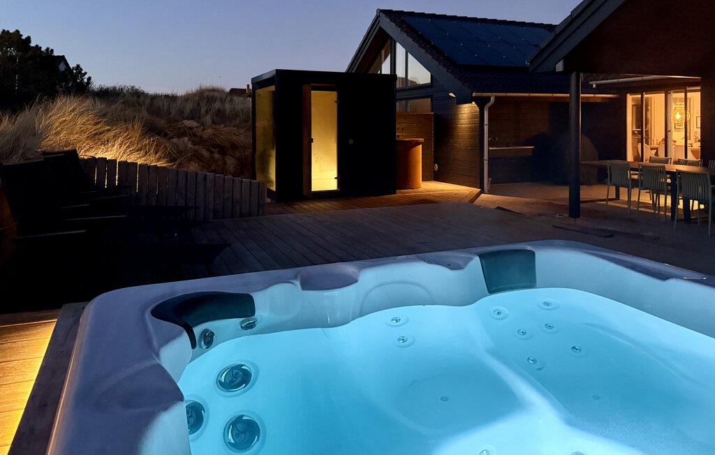 4,5Dette 200 m2 store poolhus til otte personer ligger i Houvig ved Søndervig. Sommerhuset er et godt valg for den aktive familie, som gerne vil bo i et stort sommerhus med god plads og pool til børnene. Huset har desuden et stort spabad og ligger direkte ud til