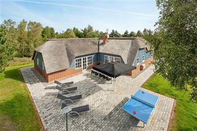 Et dejligt sommerhus med stråtag beliggende på en meget stor, delvist afskærmet grund omgivet af lyng og hedeområde. Indretning Sommerhuset egner sig til 10 personer samt 1 barn op til 3 år. Ferieboligen er på 192 m² og er bygget i 1992. I 2018 gennemgik