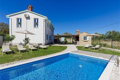 5,0Dette dejlige feriehus med pool ligger i rolige omgivelser nær byen og de skønneste strande i Istrien. Ejendommen består af to bygninger med alt til en behagelig ferie. I sidebygningen er der et aktivitetsrum, to badeværelser og et køkken. I poolen kan I