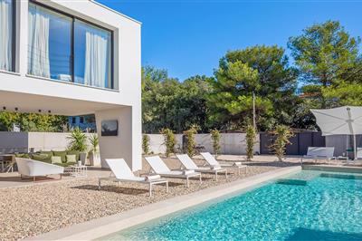 5,0Dette moderne og rummelige feriehus har fem soveværelser, seks badeværelser og en stue, på grunden er der både pool, terrasse og en gynge til familiens små. Er det ikke underholdning nok, er der legeplads 100 meter fra huset. Pakostane er en by i nærheden af