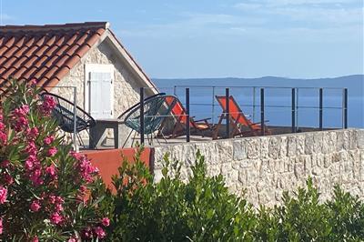 5,0På en bakketop i byen Podgora, neden for nationalparken Biokovo, ligger dette hus med pool, som er godt indrettet. Huset fordeler sig på stueplan, første og anden sal, alle forbundet med udendørs trapper. I stueplan og på første sal er der køkken i åben