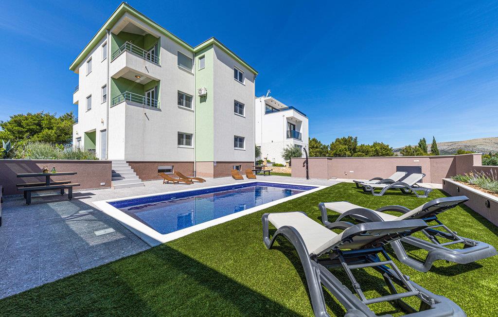 5,0Hold ferie med familien i en af disse ferielejligheder hvor I har adgang til en fælles pool. Til de mindste er der legeplads, ved siden af poolen er der et ekstra badeværelse der også kan benyttes af alle. I bor i Trogir, på Ciovo-siden. Tilkørslen til huset