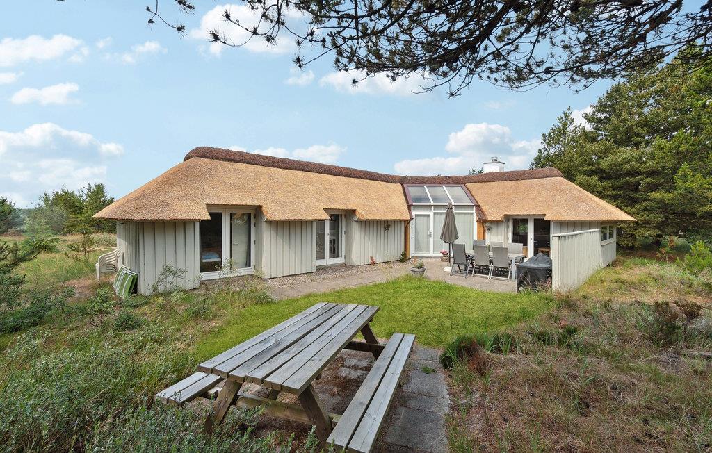 Ved Tranum Strand finder du dette charmerende stråtækte sommerhus i et unikt, ugeneret ferieområde med fælles pool. Huset byder på to soveværelser med dobbeltsenge og to ekstra soveværelser med hver to enkeltsenge, hvilket gør det ideelt for familier eller