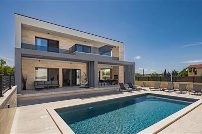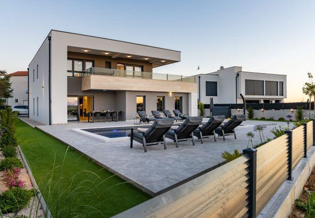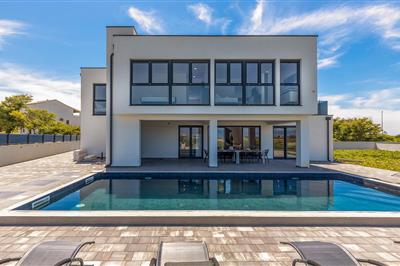 4,0Glæd jer til en afslappende ferie i dette luksuriøse feriehus med pool og havudsigt. Den moderne Villa Nin ligger i en lavvandet lagune og byder jer velkommen med et minimalistisk og eksklusivt interiør. Store vinduer tilbyder udsigt over det maleriske