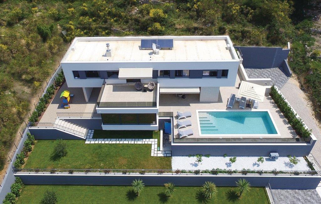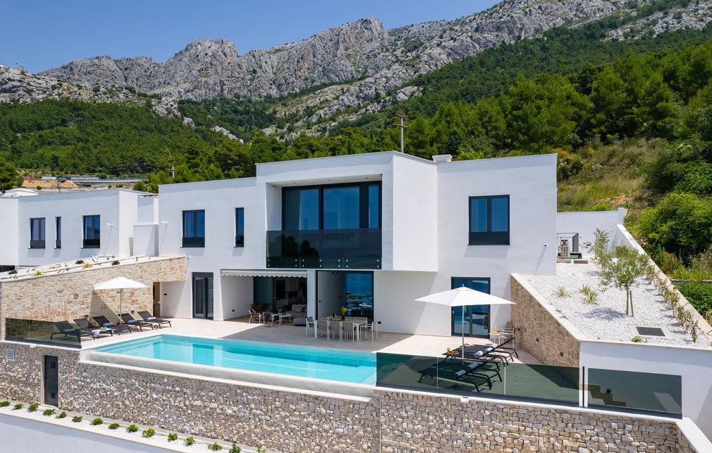 Denne attraktive ferievilla ligger i Omiš, i det mondæne boligområde Brzet. Feriehuset er rummeligt og godt udstyret. Set udefra dominerer de berømte sten fra Brac og et elegant hegn af mørkt glas. Husets indre er indrettet med god smag og de store