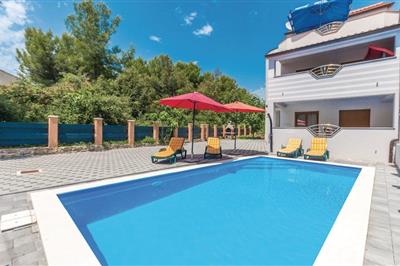 I den lille kystby Pakoštane, som ligger mellem havet og Vrana søen, ligger dette vidunderlige feriehus med pool. Det er komplet udstyret og smagfuldt indrettet, og byder sine gæster velkommen med en behagelige ferieatmosfære. På den velplejede grund står en