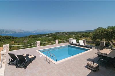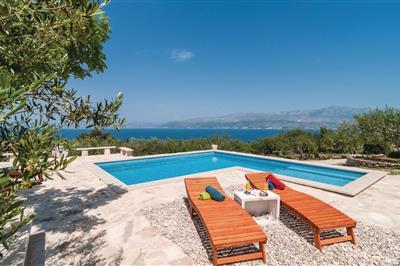 Skønt hus med pool, panoramaudsigt og fantastisk beliggenhed kun få minutters gang fra stranden - oplagt til familien. Glæd jer til at tilbringe ferien i dette feriehus på øen Brac. Huset fremstår flot og hjemligt og er indrettet lyst og farverigt. Det er