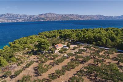 Dette lækre moderne stenhus har en smuk og sjældent rolig beliggenhed nær Postira på øen Brac. Huset ligger på en stor indhegnet grund i en velholdt olivenlund med panoramaudsigt til havet. Huset består af to smukke soveværelser, et badeværelse og en stue