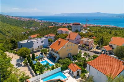 Omgivet af natur og oven for feriebyen Crikvenica ligger dette skønne feriehus med en herlig panoramaudsigt over byen, havet og landskabet. I stueetagen har I opholdsområdet og en overdækket terrasse med en mobil grill. På første sal ligger der fire