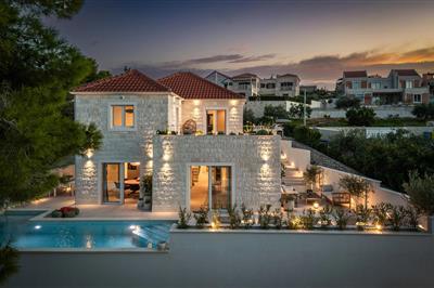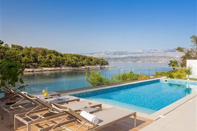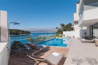 Hvis I leder efter luksuriøs og charmerende indkvartering, er I kommet til det rigtige sted. Den moderne villa ligger i en smuk bugt med udsigt over havet i Splitska på øen Brac og har 6 soveværelser, 6 badeværelser, et fuldt udstyret køkken, en rummelig