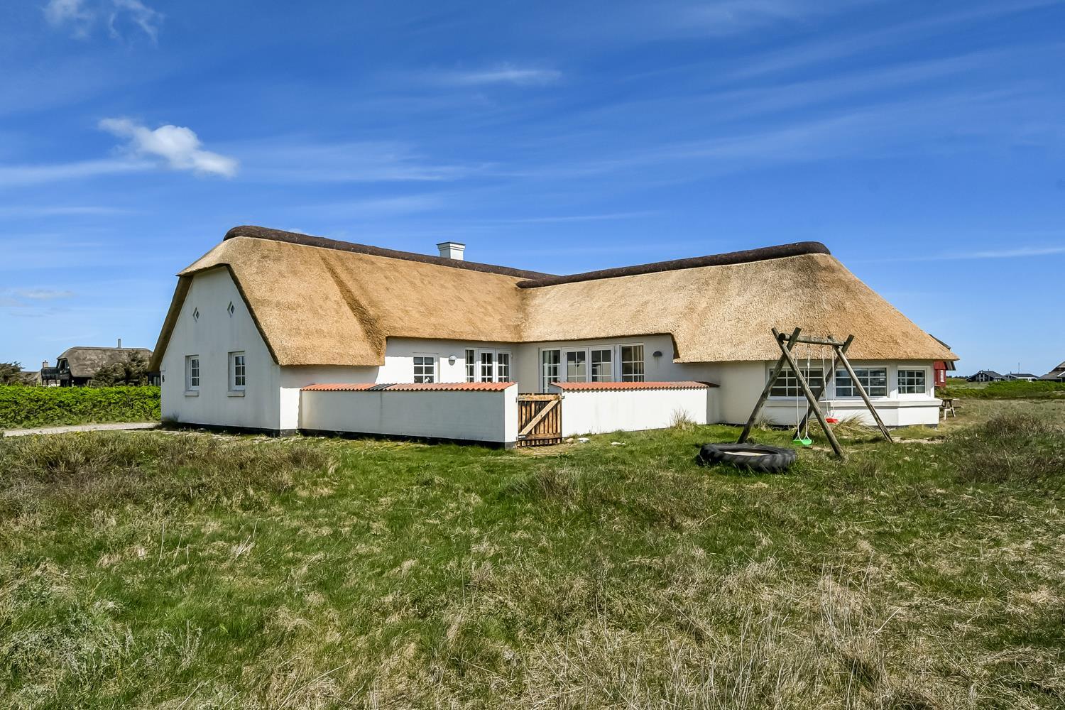 3,9Pænt stråtækt stenhus med Wi-fi og halvcirkelformet poolrum med spa, sauna. Unikt beliggende, moderne feriehus med alle tænkelige faciliteter kun 100 m. til Vesterhavet. Nyd husets mange muligheder eller gå en tur ved Vesterhavet. Husets indretning Huset er